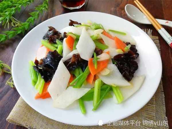 所需材料:山药250克、芹菜1把、木耳适量、胡萝卜1段、油盐适量、姜1片、大蒜2瓣、鸡精1茶匙、水淀粉适量