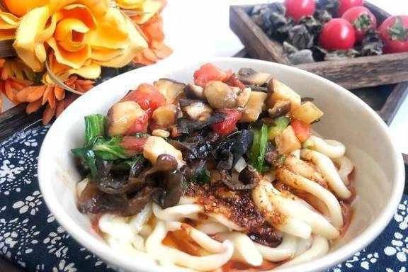 步骤一、事先准备好制作快手剪刀面所需要的食材和全部配料,我们首先来和面,小碗里接适量的温水,称量五百克左右的面粉倒进面盆中,拿一双筷子沿着统一顺时针方向进行搅拌,一边加水一边搅拌。面粉加水后会先搅成面絮状,再用力揉按一段时间,最后成团表面是比较光滑的。把面团取出放在案板上,铺上保鲜膜或者盖上盖子静置醒发三十分钟左右,过十分钟可以拿出来简单揉按一下,这是让面条更加劲道的技巧之一。步骤二、在等待面团醒发的过程中我们可以来准备面条搭配的多种食材,提前抓一把黑木耳干放到清水碗中浸泡五到十分钟,泡发后和西红柿、五朵香菇、青菜、大葱全部置于流水下冲洗两遍,分别去掉蒂部或者根部等不可食用部分,切成西红柿丁、香菇丁、青菜段、木耳丝和葱花备用。步骤三、干净无水的不粘炒锅加热并淋入适量的食用油,下入葱花开始煸炒。爆出葱香味以后依次放入香菇、西红柿和木耳,因为青菜容易熟所以最后下锅。炒西红柿的时候可以把火调大些,这样能将西红柿炒出沙,加适量的食盐、花椒粉和生抽进行调味,与全部食材翻炒均匀即可盛出备用。步骤四、醒发过后的面团白白胖胖的,取出简单按压。因为我们不是专门做面条的,所以整个剪面条的过程还很不熟悉,就不能向店里一样站在锅边边剪边煮,只能先剪好装在盘中等之后统一下锅。步骤五、汤锅中接适量清水,水量最好多一些,盖上锅盖加热,等到烧开即可下入面条,煮熟后捞出沥干多余的水分,最后把炒好的配菜浇在上面,拌匀后即可食用。步骤六、这样煮出来的面条还能保持筋道的口感。步骤七、喜欢吃辣的朋友们别忘了放两勺自己做的辣椒酱。【烹饪窍门】: