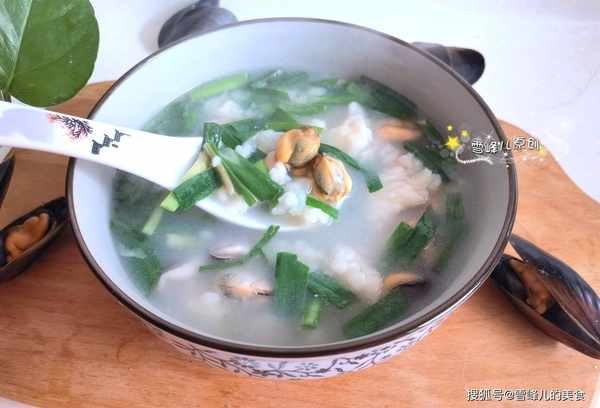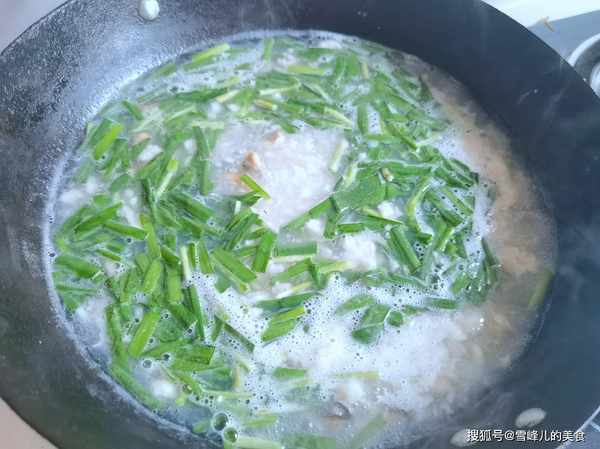 第八步:放入适量的韭菜烧开,不需要加盐,海虹中 盐分不低,不放盐咸淡就正好。