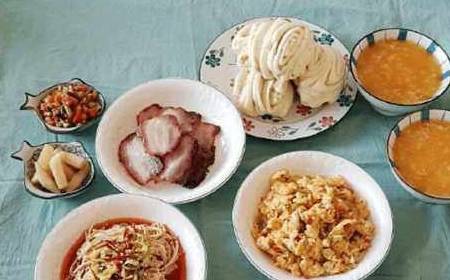 这是表姐为我精心准备的午餐,没错,是两个人的份量没错!在东北,这样的配搭也是很正常,显得突兀的就是,我亲手晒制的广式晒肉。跟东北这里晒制的有些不同,往下再跟大家介绍一下。这南瓜粥煮了一大锅,我看这早餐午餐还不够,晚餐也定能用上的!花卷也是早上蒸的,表姐把一天的量都计算的不错嘛!
