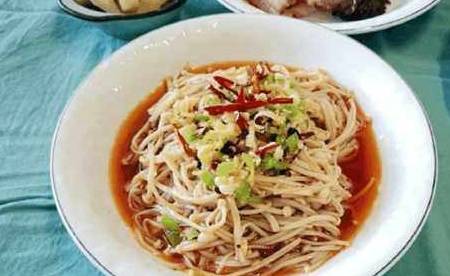 金针菇先焯水,沥干以后放入各种的调味,麻油、辣椒油、蒸鱼豉油、葱、蒜拌一起就行,量就得自己把握了。不要怪我说得简单,因为表姐也是这样教我的。