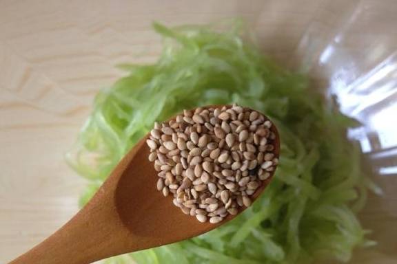 6.熟白芝麻拌匀,最后用红椒圈点缀即可