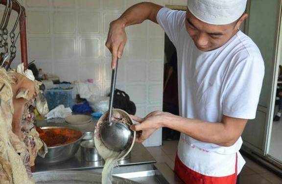 这师傅正在给顾客煮羊汤,他们家的羊汤都是提前熬好的,每天半夜就得爬起来熬汤,要忙到后半夜才能做完,然后早上就开门营业了,生意的火爆不容得他们偷懒
