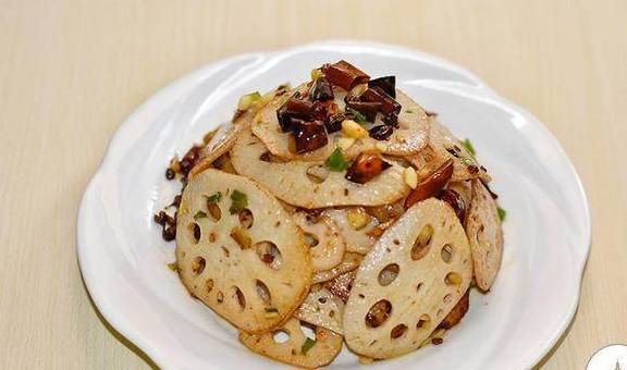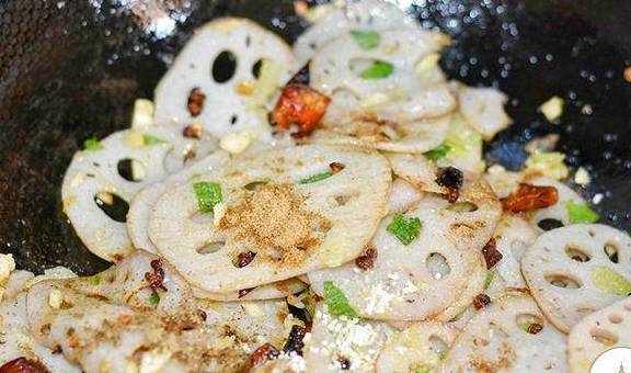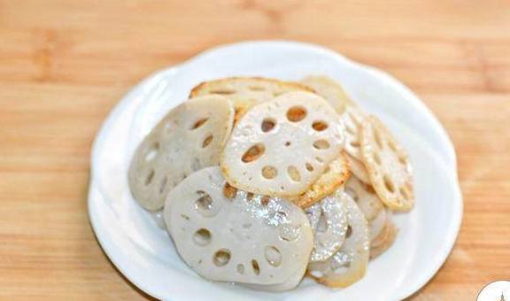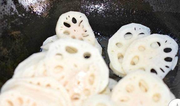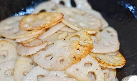 4、藕片煎炒至金黄色即可;