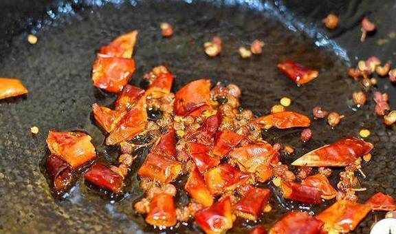 6、锅里加少许油,加入干花椒、干辣椒爆香;