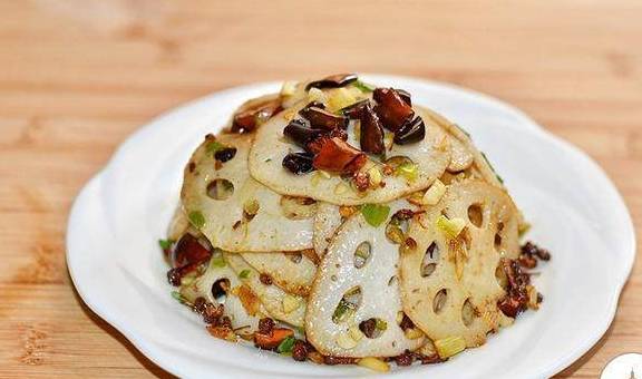 11、出锅装盘,麻辣味十足的藕片就做好了,藕片吃起来特别香,做了一大盘上桌分分钟被吃光,家人都说太好吃了,我也觉得藕片这样做比其它做法都要好吃。