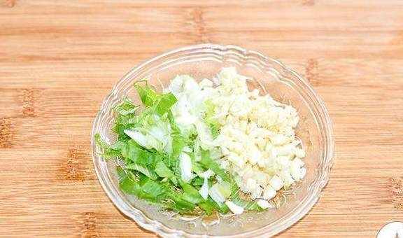 2、大葱洗净切末、蒜用菜刀拍扁切末备用;