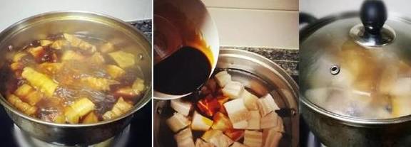 3、炖到一个小时的时候放入泡好竹笋(或鸡蛋),继续小火炖半个小时至汤汁变少,肉酥烂,记得中途要翻动两次;开大火,边翻炒边收干汤汁,注意不要收过头,留点汤汁拌饭是极品,外婆红烧肉出锅!