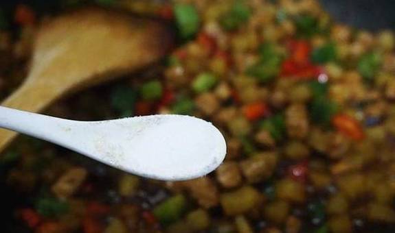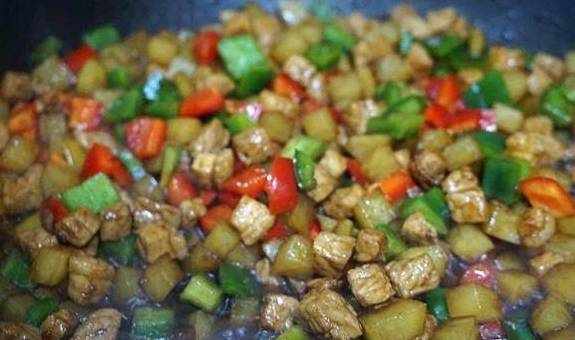 4、接着倒入彩椒丁,加入少许盐。彩椒就很容易熟了,翻炒后2分钟即可出锅。不要等收汁太干,有些许汤汁的才好吃。