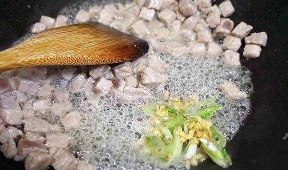 2、坐热油锅,放入少许食用油,先放入肉丁,快速翻炒至变色,接着倒入一大勺的料酒,加入葱末姜末炒匀。