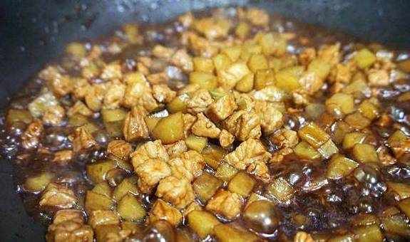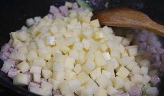 3、放入土豆丁,加入1小勺的老抽,翻炒均匀后加入小半碗开水,焖5分钟。