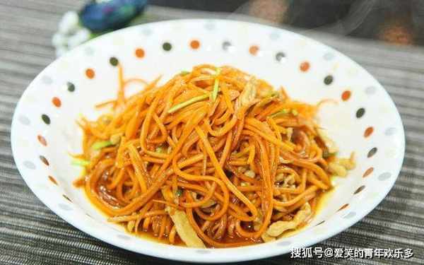 3、底油炒胡萝卜丝,加少量热水稍煮变软,拌入肉丝。