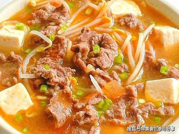 番茄,嫩豆腐,牛肉,绿豆芽,葱花。