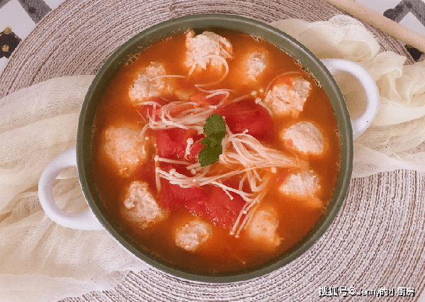 最后放入金针菇,再开中火煮两三分钟。丸子熟透后,加点盐调味,就可以关火了。