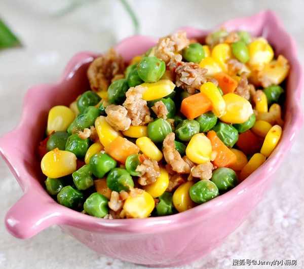 接着倒入肉末翻炒,炒到变色。最后倒入豌豆、玉米粒、胡萝卜丁翻炒均匀,这道菜就做好了。