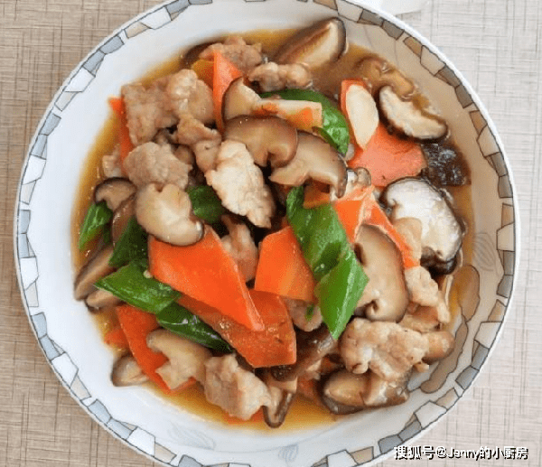 香菇洗净,切成薄片;胡萝卜去皮洗净,切成薄片;青椒洗净切块待用;姜丝、蒜末切好待用。