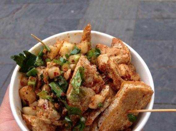 臭豆腐在小吃街几乎随处可见。而臭豆腐的味道有些人就会接受不了,也有一些人特别的喜欢,在中国最出名的就是长沙臭豆腐了。特别的辣酱淋在外酥里嫩的臭豆腐上面特别的好吃。
