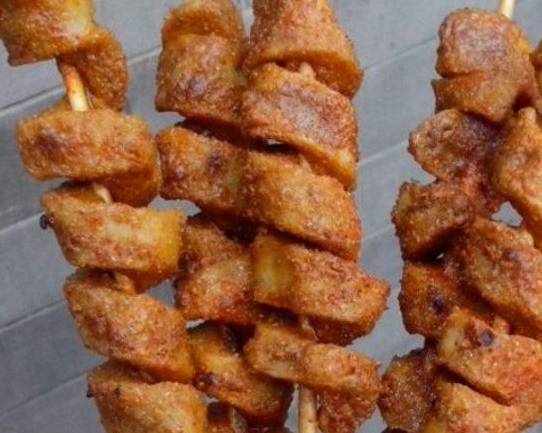 在小吃街除了臭豆腐还有烤面筋,每次看到小贩前一串一串的面筋上面洒满了各种调料,大老远就可以闻到香味。这种烤面筋价格也便宜特别的受学生党的喜欢。