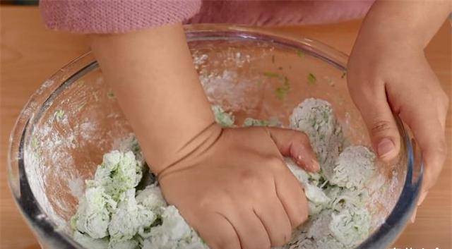 4.拌匀后加入木薯淀粉。淀粉可以增加其硬度。之后,我们会加入一些面粉来增加它的附着力,然后揉成面团。