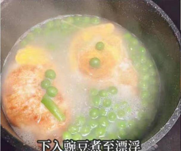 第五步:加入一些青豆,煮至豌豆浮在上面,然后加入一些嫩豆腐块,煮约两分钟。