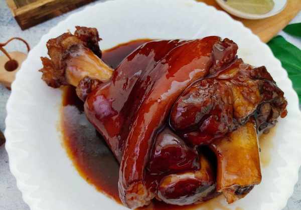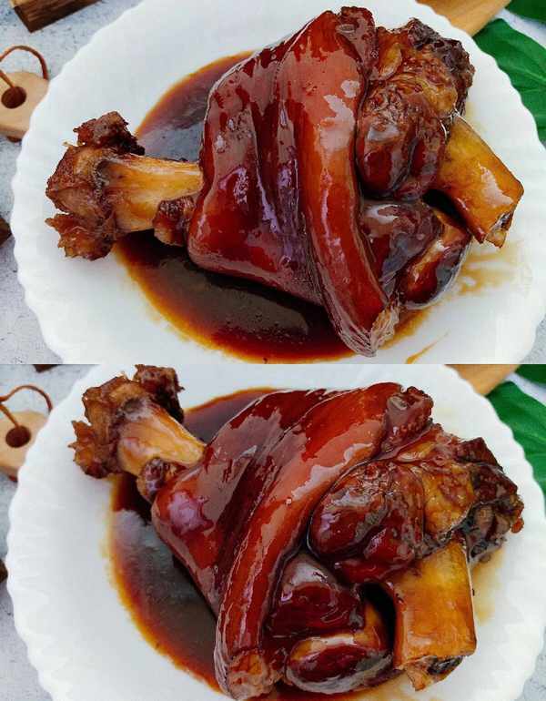 3、小火慢炖2小时后,肘子的皮肉已经软烂,酱汁和各种调料的味道也已经吃进了肘子里。如果想要口感更滑嫩,可以稍微加热一下融化。冰糖,加入肘子汤少许,烧开后倒入淀粉水,一起拌匀,烧开后浇在肘子上。