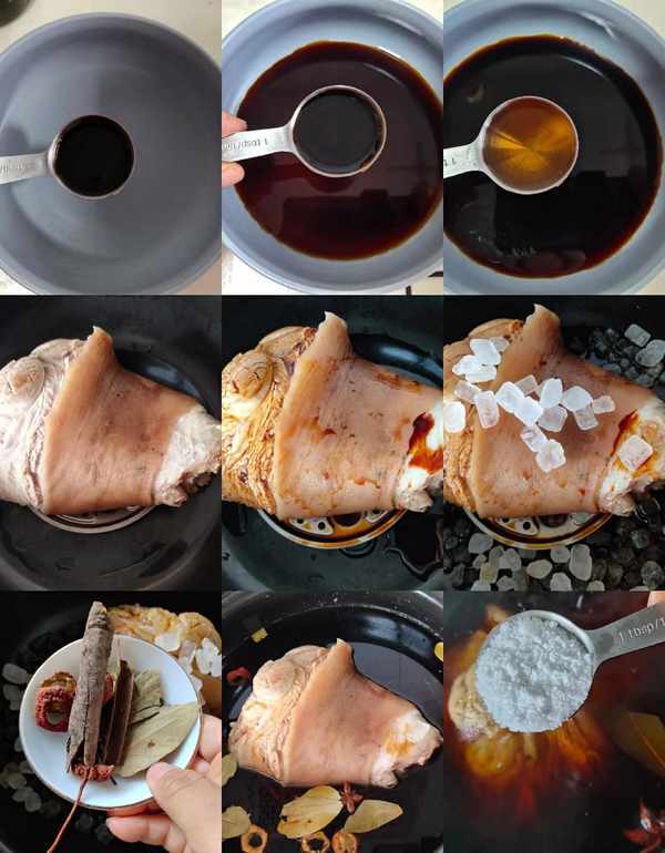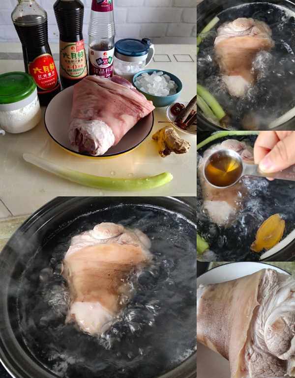 1.将手肘处的毛拿掉洗净。在冷水下的锅中加入红葱头和2汤匙料酒。煮沸后,去除泡沫。另取一碗打酱油,在碗中加入生抽4勺、红烧酱油2勺、料酒2勺,搅拌均匀备用。