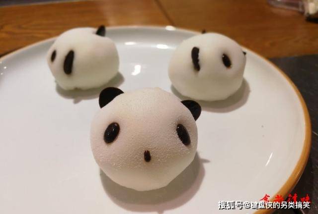 三只可爱的熊猫脑袋,制作的惟妙惟肖,用糯米做皮,眼睛和鼻子用巧克力做成,软软糯糯的质感,轻轻咬一口发现有草莓颗粒,内部夹馅香浓的奶油,超萌的甜品菜。