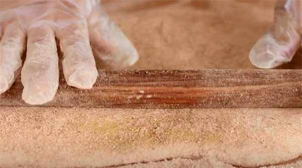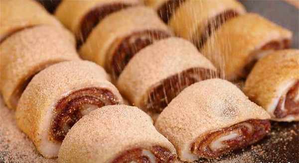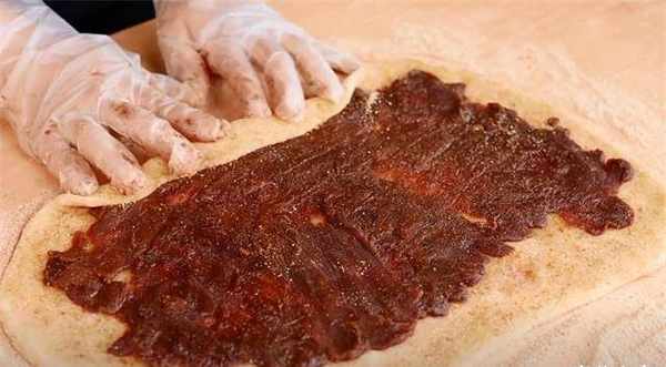 5.在中间的馅料上挤上一些豆沙馅,把馅料抹平,从下往上卷起来。