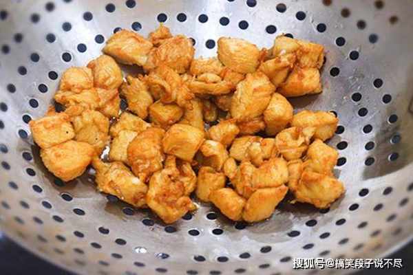 锅内烧油,油温四成热时倒入鸡丁,快速滑油20秒钟,鸡丁发白、出香味以后立即倒出控油,滑油的时间太长吃着就不嫩了。