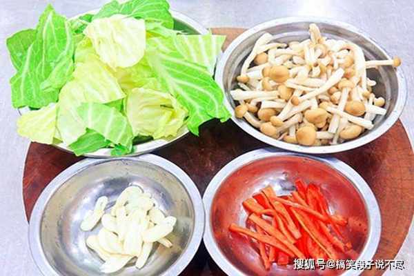 把买来的蟹味菇切去根部,放入淡盐水中多淘洗几遍;把包菜切去根茎只保留嫩叶,然后用手撕成小块,大蒜切成蒜片,再切一块红椒用来配色,喜欢吃辣的也可以换成小米辣。