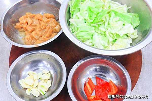 鸡胸肉300克,从中间片开、切成鸡丁,加入料酒5克,生抽10克,抓拌均匀腌制10分钟;包菜半个,去除根茎后撕成小块,用淡盐水泡一下洗干净;红椒切成片用来配色;鸡丁腌好以后撒入淀粉拌匀锁住水分,再淋点植物油防止粘连备用。