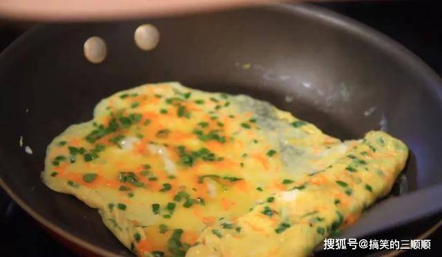 6. 转动锅底,使蛋液平铺整个锅底,煎至成型后翻面继续煎。