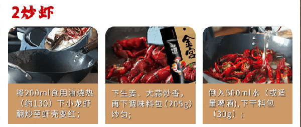 用金宫的小龙虾调料调料烹调出来的小龙虾,外壳红亮、虾肉细嫩、虾香浓郁,滋味又麻又辣又鲜,鲜嫩弹到爆。不仅色泽红亮,而且味道够麻够辣,入口劲爽美味,让人吮指停不了。而且,每包料可做3斤虾,用料足、提色好、辣的舒服、麻得安逸。