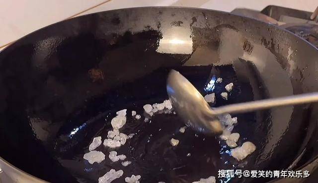 3、热锅,放油,放冰糖,炒出糖浆。