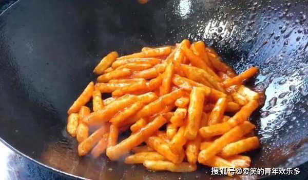 9、快炒1分钟,给土豆条粘上糖醋汁。