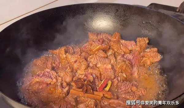 4、倒入牛肉翻炒,炒出糖色。