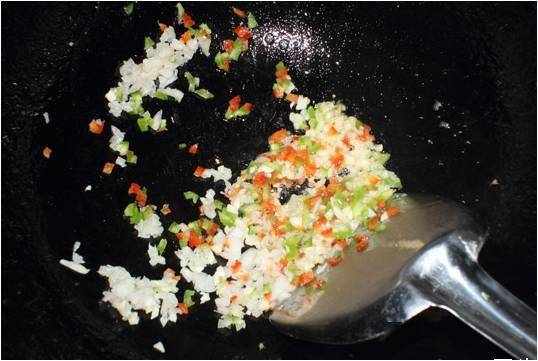 把油倒出,剩一点底油大火煸青红椒、小洋葱和蒜末五秒钟出香气