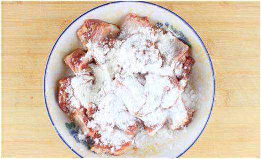 然后将适量的面粉和淀粉倒进去搅拌均匀后腌制两个小时最好
