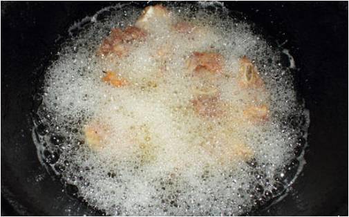 坐锅倒油,把排骨放进去炸,表面焦黄色就可以出锅备用
