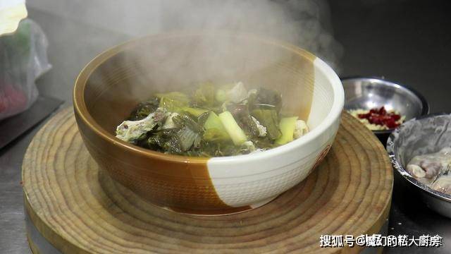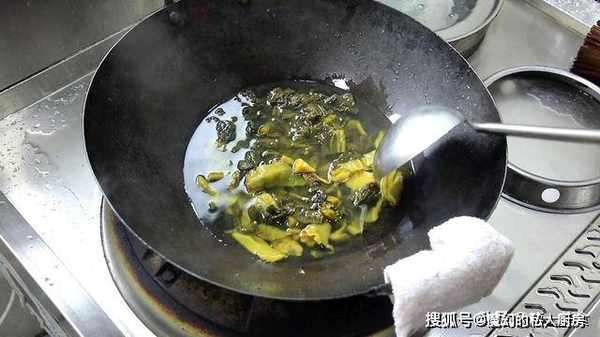,蛋白质遇热释放胶质,煎熟后加入开水,倒入炒香的酸菜。