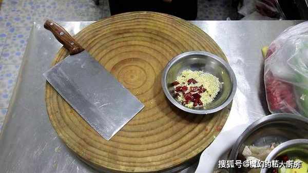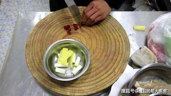 生姜一块切成姜片,大葱白一根切成葱段,抓入花椒10克,干辣椒15克。