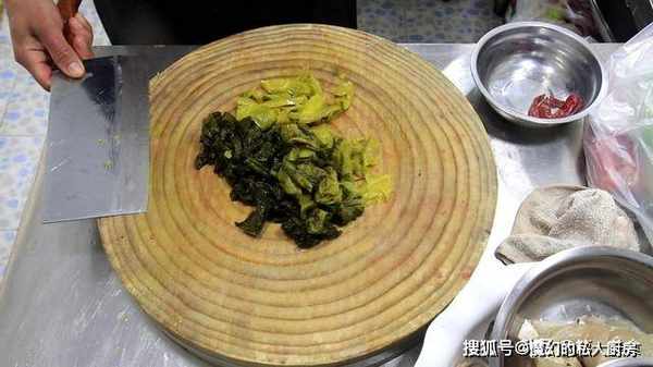 5.在腌制的时间,我们再准备一下配菜,酸菜一包切成小段,根部比较厚切薄一点,放入盆中备用。