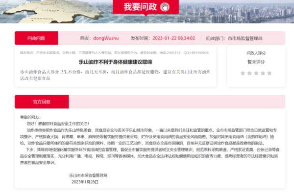 针对该网友的建议,乐山市市场监督管理局表示,十分感谢网友对食品安全工作的关注,并公开回应称,油炸串串类煎炸食品作为乐山特色美食,其食品安全与否关乎乐山城市形象,一直以来是市场监管部门关注和监管的重点。