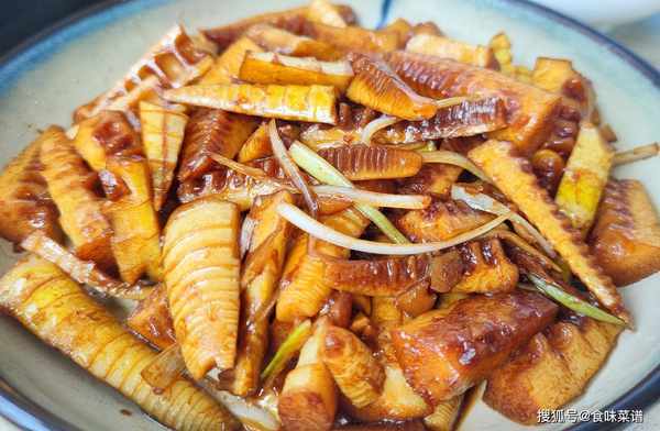 2、起锅烧油,放姜片炒香,接着倒入竹笋,大火爆炒几下,调味放老抽半勺,生抽2勺,白糖1勺,盐适量,加少许清水,盖盖焖3分钟。