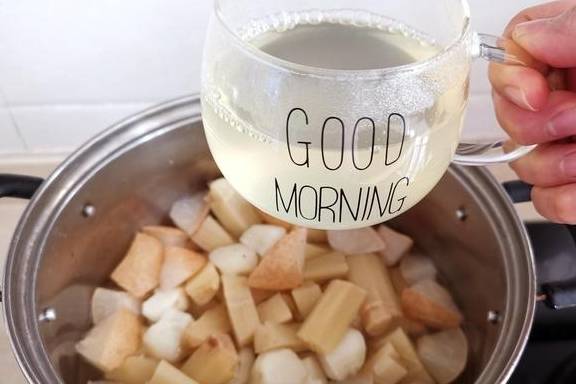 准备1个罗汉果,2节大约30cm长的甘蔗,1个梨,7、8个马蹄。甘蔗去皮,切成小块;梨不用去皮,用盐多搓一会儿果皮,再洗干净,带皮切成小块,果核去掉;马蹄去皮;罗汉果掰碎。全部材料放入锅中,加大约2L水,煮约20分钟,去渣取汁。