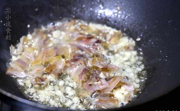 锅内倒入适量植物油,烧热,加入蒜末爆香,再放入切好的培根片开始翻炒出香味。