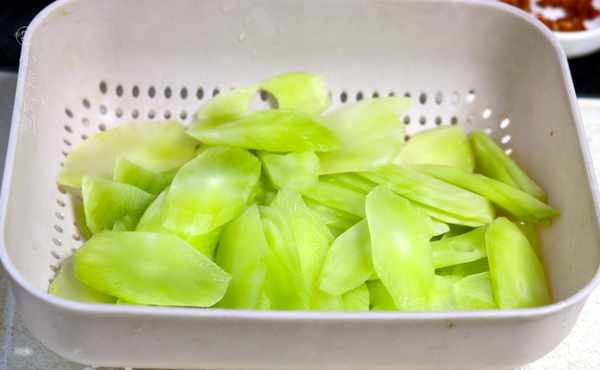 去掉生菜的皮并洗净。这一步可以由街头小贩为您处理。加工好后直接切成片,切得稍微薄一点。