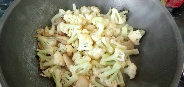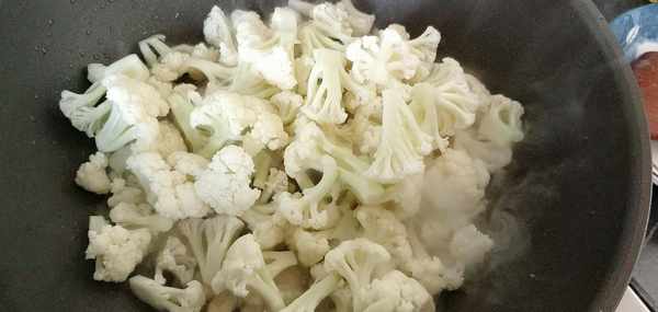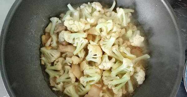 6.加入适量的清水焖煮一会(大概5分钟左右,花菜很好熟);