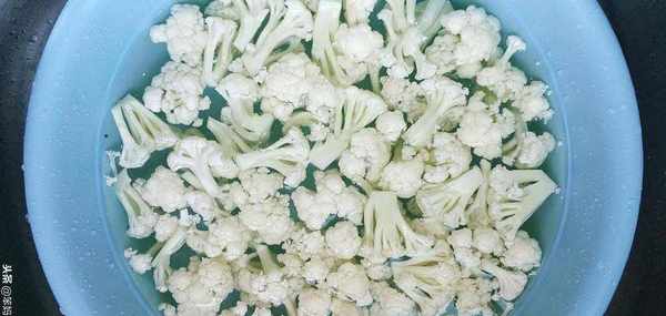 1.新鲜的花菜掰成小朵,放淡盐水浸泡半个小时(去虫去农药);
