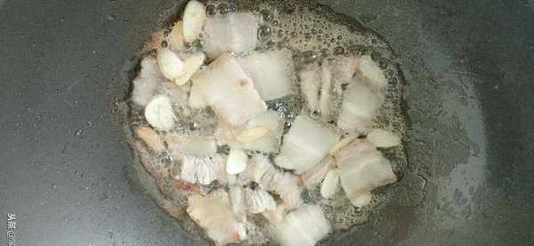 3.炒锅烧热,放入少许食油,放入五花肉煸炒出油(这样吃着就不会太腻了),放入大蒜片;